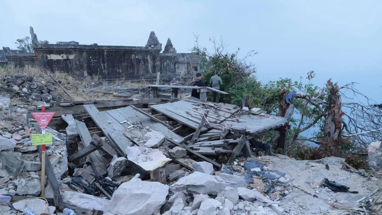 It is noted that Preah Vihear Temple sustained damage at 142 locations during the armed attacks in July 2025, with an additional 420 locations damaged following December 2025. This destruction spans from the Pei Ta Daed cliff and the 1st Gopura through to the 5th Gopura. The impact includes the Indian cooperation project site at the 5th Gopura, the northern staircase restoration site (funded by the U.S. Embassy), and significant damage to Wat Keo Sekha Kirisvara.